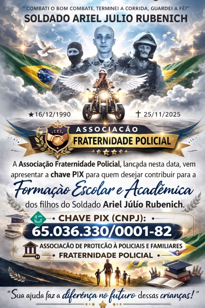 Como primeira ação, a Associação Fraternidade Policial está arrecadando fundos, de forma voluntária, por meio de chave PIX correspondente ao CNPJ da entidade (65.036.330/0001-82). O objetivo é contribuir com a formação acadêmica dos filhos do Soldado Ariel Júlio Rubenich, vitimado em 25 de novembro de 2025. A participação da comunidade é fundamental para fortalecer a rede de apoio aos profissionais de segurança e suas famílias.