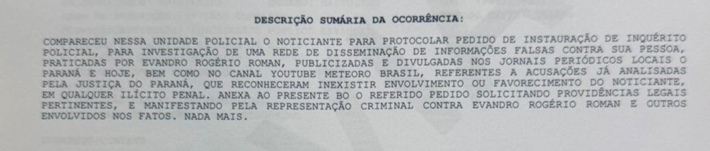 No registro, o secretário afirma que as acusações mencionadas já teriam sido analisadas anteriormente pela Justiça do Paraná, que teria reconhecido inexistir envolvimento ou favorecimento dele em ilícitos penais relacionados aos fatos citados. Ele anexou ao boletim pedido de providências legais e manifestou intenção de representação criminal contra Roman e outros possíveis envolvidos.