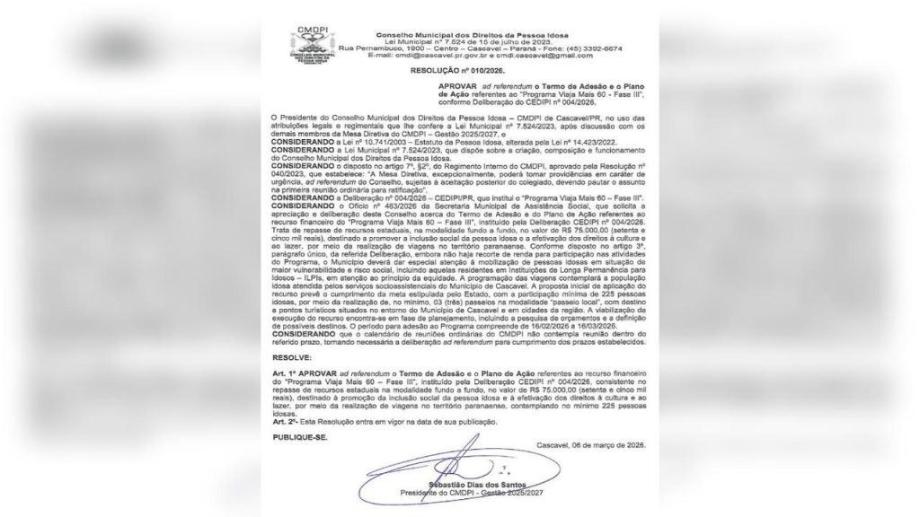 Cascavel aderiu ao programa estadual Viaja Mais 60 – Fase III, iniciativa voltada à promoção de atividades de lazer, turismo e integração social para pessoas idosas.