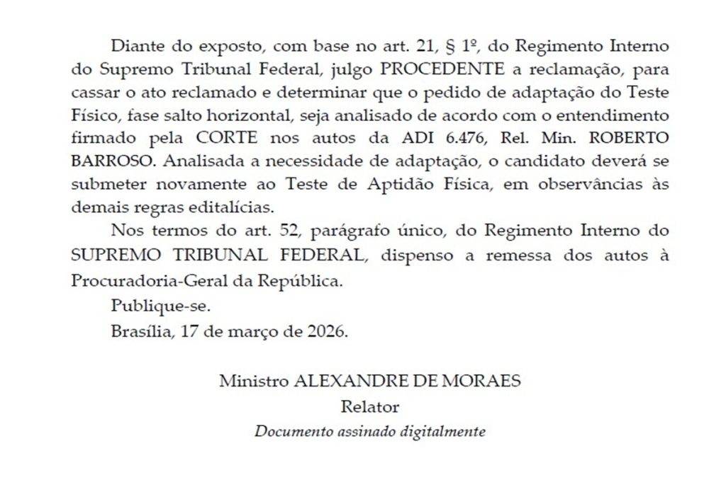 Na decisão, Moraes destacou que não é razoável exigir testes físicos que não sejam essenciais para o exercício da função. O ministro também apontou que o próprio edital prevê vagas para pessoas com deficiência em cargos técnicos, nos quais determinadas exigências físicas não são determinantes para o desempenho profissional.
