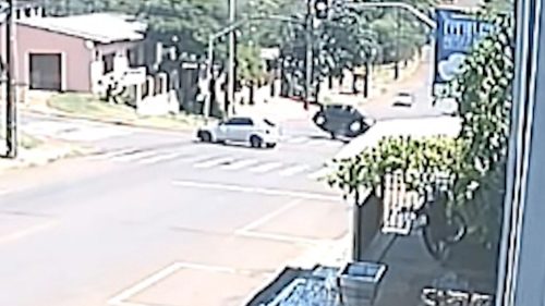 Imagens de uma câmera de segurança registraram o momento exato do acidente ocorrido na tarde deste domingo (29), no cruzamento da Rua Copacabana com a Rua Europa.