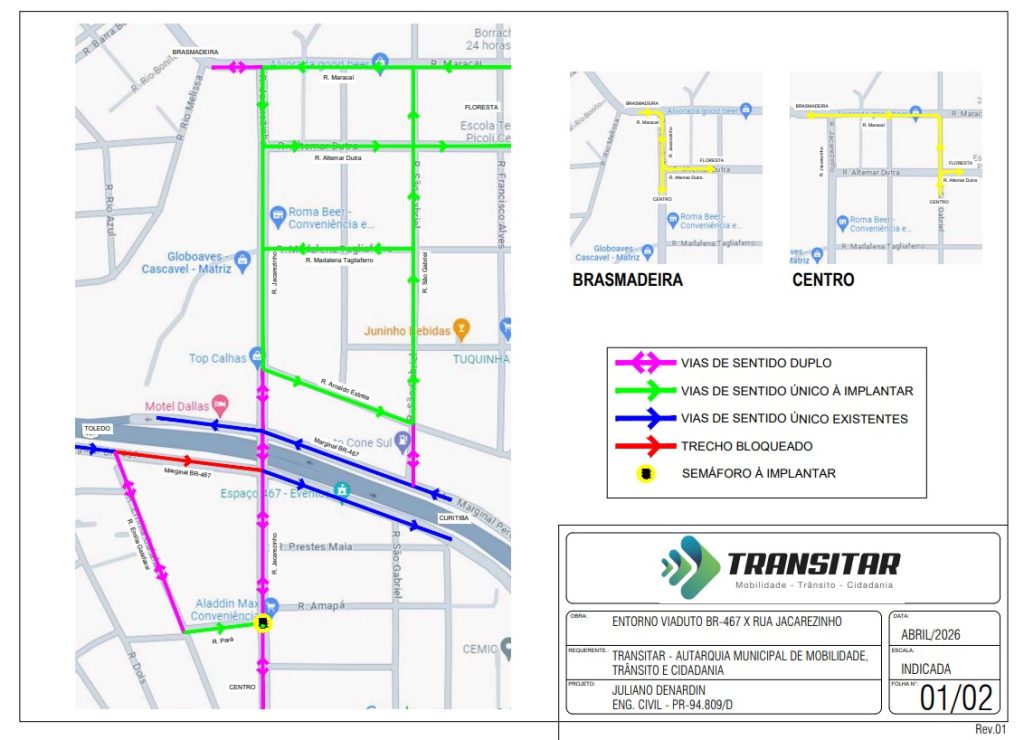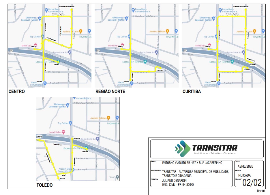 A Prefeitura de Cascavel inicia, na próxima segunda-feira (6), uma intervenção viária de grande porte no viaduto da Rua Jacarezinho sobre a BR-467 e nos acessos da região Norte. O projeto desenvolvido pela Transitar e executado pela Secretaria de Serviços e Obras Públicas (Sesop), vai impactar um dos pontos mais estratégicos da cidade: a região Norte, que concentra cerca de 130 mil moradores e tem, o viaduto da Jacarezinho, como uma das principais vias conectivas entre bairros como Floresta, Brasmadeira e Centro.