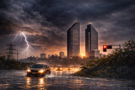 A previsão indica chuva intensa, com volumes entre 20 e 30 mm por hora, podendo alcançar até 50 mm ao longo do dia. Além disso, há expectativa de ventos fortes, variando entre 40 km/h e 60 km/h, e possibilidade de queda de granizo. Um cenário que, embora não seja classificado como extremo, levanta alerta para transtornos pontuais.