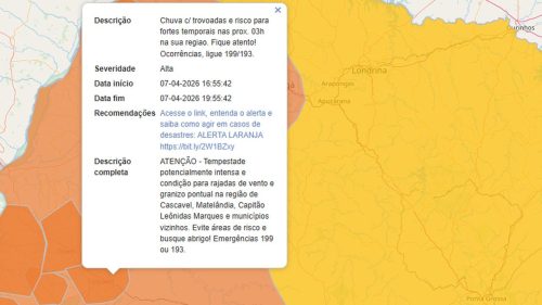 A previsão aponta para condições favoráveis a rajadas de vento e queda de granizo pontual, podendo atingir, além de Cascavel, cidades como Matelândia e Capitão Leônidas Marques, bem como os municípios vizinhos.