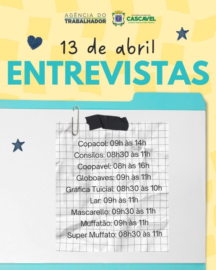 Os interessados devem procurar atendimento presencial na Agência do Trabalhador de Cascavel, localizada na Rua Paraná, nº 3.648, no Centro.