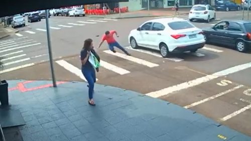 Uma câmera de monitoramento flagrou o momento em que um homem de 38 anos foi atropelado na tarde desta segunda-feira (13), na Rua Rio Grande do Sul esquina com a Rua Carlos de Carvalho, no Centro de Cascavel. O acidente aconteceu enquanto a vítima tentava atravessar a via correndo pela faixa de pedestres em meio aos veículos que trafegavam pelo local.