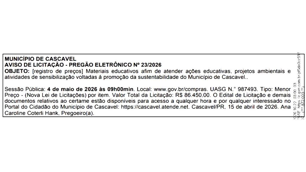 Paralelamente, o município também abriu processo licitatório para aquisição de materiais educativos que serão utilizados em projetos ambientais e ações de sensibilização. O investimento previsto é de R$ 86 mil, reforçando o compromisso com a formação de uma consciência ambiental mais sólida.