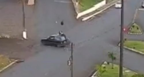 Segundo as imagens, o Fiat Uno cruzava a pista quando o motociclista, que vinha em outra via, não conseguiu frear a tempo e atingiu em cheio a lateral do carro. O impacto foi tão forte que o motociclista foi arremessado ao chão.