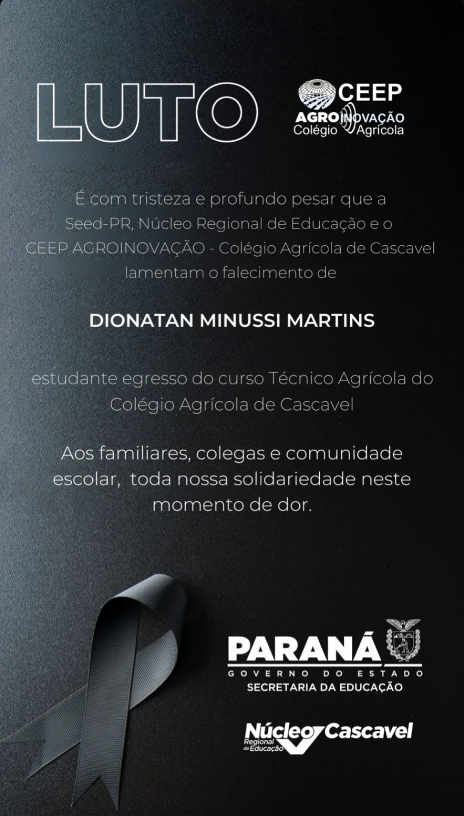 Como Chefe do Núcleo Regional de Educação de Cascavel, e também como amigo pessoal desta família, uno-me profundamente a este luto. Falo não apenas em nome de uma instituição, mas com o coração tocado pela convivência, pelo carinho e pelos laços que nos unem. Dionatan não foi apenas um ex-aluno, mas parte viva da nossa história, da nossa missão e da nossa família educacional.