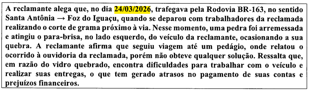 De acordo com a petição inicial, a autora relatou que seguia pela BR-163, no sentido Santa Antônia a Foz do Iguaçu, quando se deparou com trabalhadores da empresa atuando nas margens da rodovia. Segundo a narrativa levada ao processo, uma pedra teria sido lançada durante o serviço e atingido o para-brisa do veículo, no lado esquerdo, provocando a quebra do vidro.