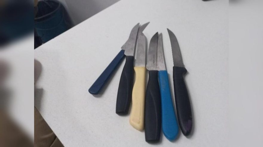 Durante as diligências, a equipe localizou o suspeito nas proximidades. Ele estava com diversas facas presas à cintura e entre as vestes, apresentando sinais de embriaguez. Apesar de negar as acusações, o homem foi abordado e, durante a busca pessoal, os policiais apreenderam seis facas.