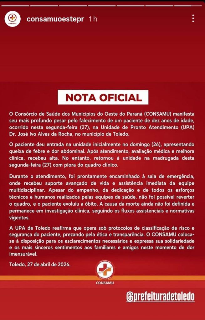 Uma nota oficial divulgada pelo Consórcio de Saúde dos Municípios do Oeste do Paraná (CONSAMU) informou a morte de um paciente de 10 anos ocorrida nesta segunda-feira (27), na Unidade de Pronto Atendimento (UPA) Dr. José Ivo Alves da Rocha, em Toledo.