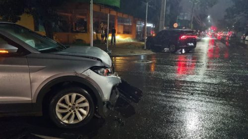 A ocorrência envolveu Chery e um Volkswagen T-Cross, ambos com danos materiais após a colisão. Com a força da batida, o T-Cross permaneceu parado no meio da pista, enquanto o outro veículo acabou subindo à calçada.